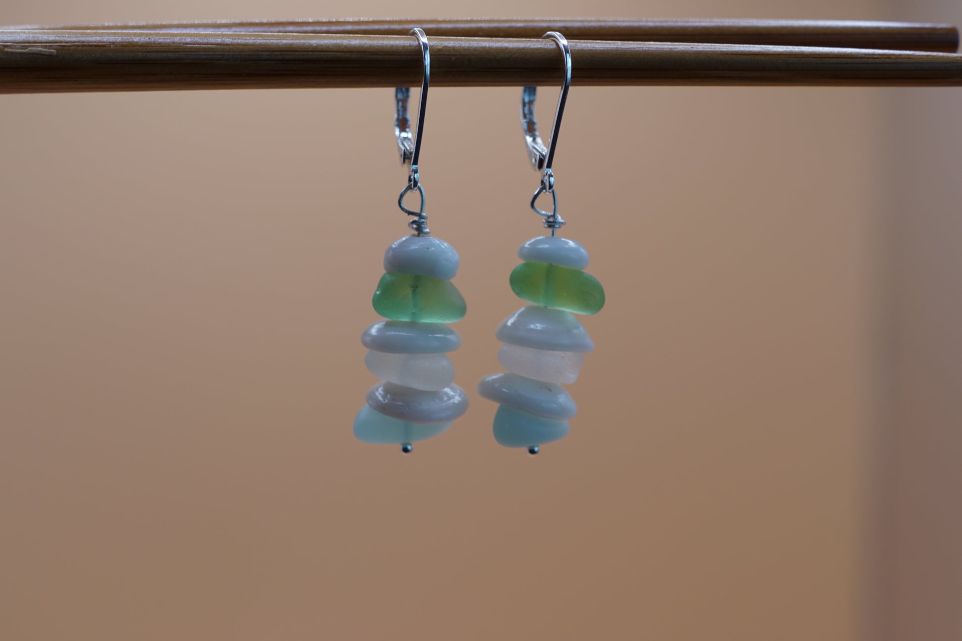 Accented with aqua-toned recycled glass pebbles that mimic the soft shimmer of sea glass, these earrings add a refreshing pop of color. Each piece is carefully wire-wrapped in sterling silver and finished with sterling silver lever back hooks for lasting comfort and elegance.