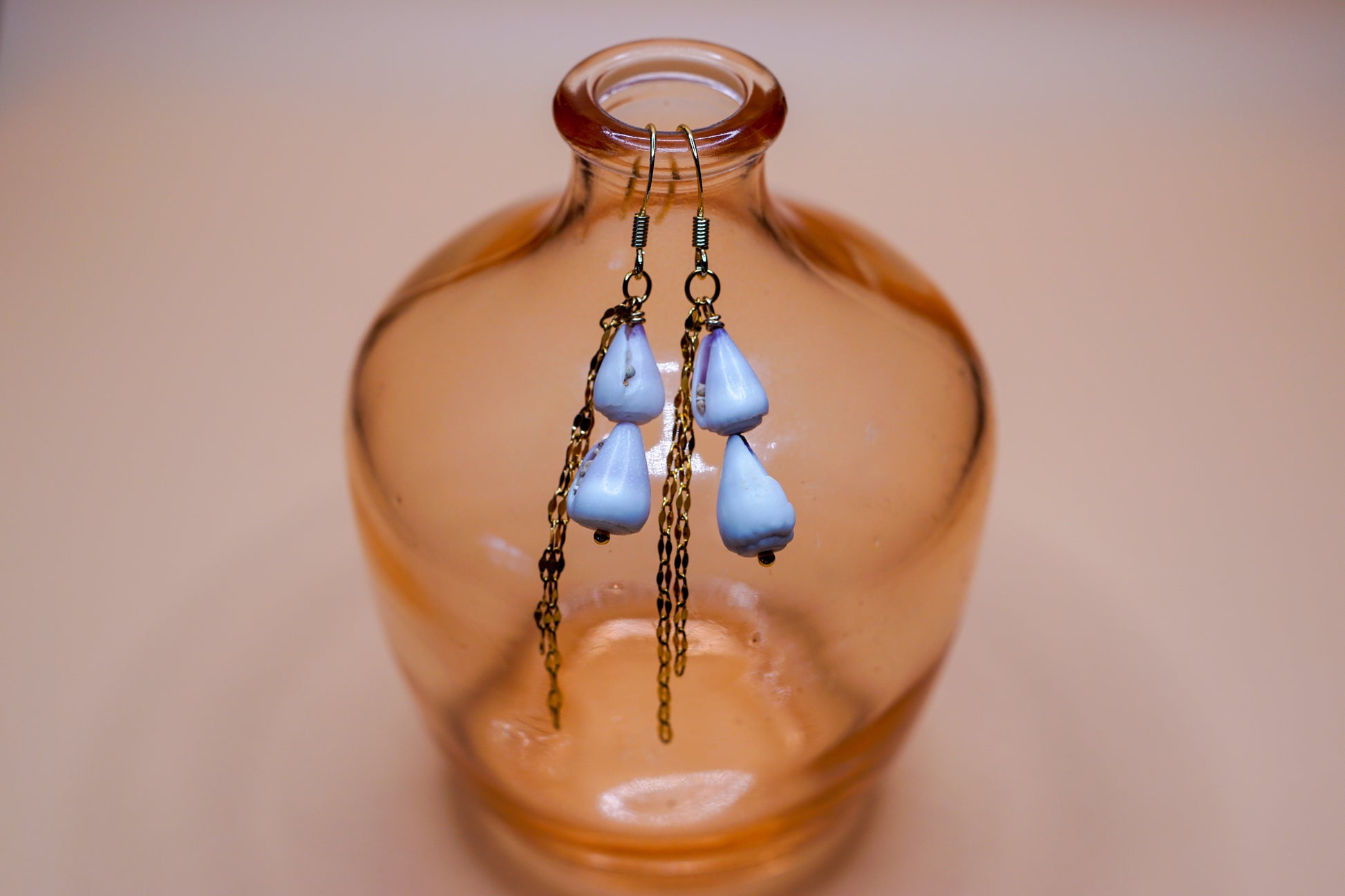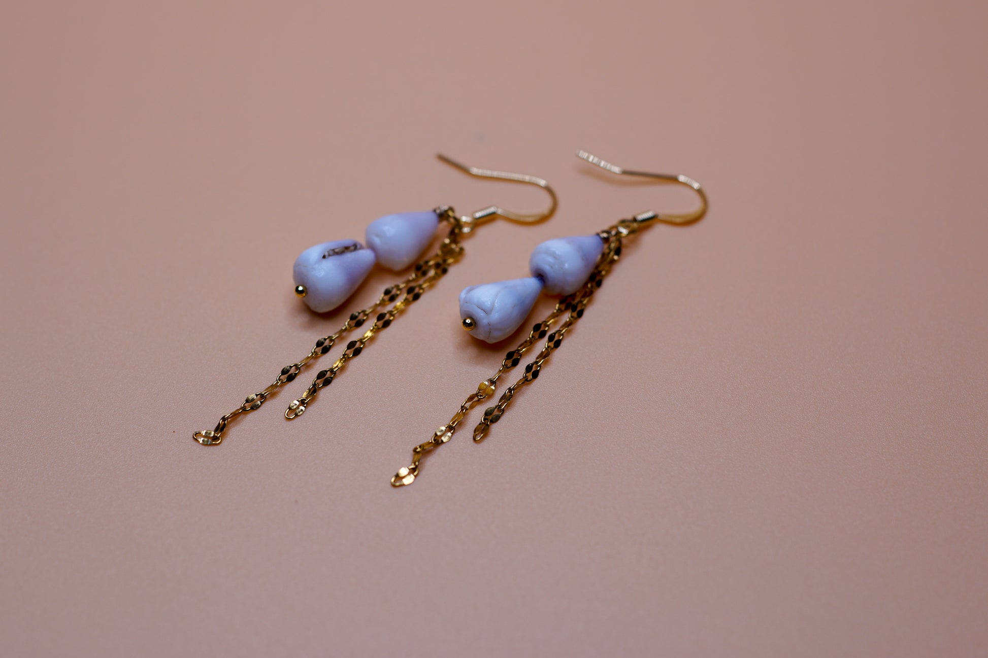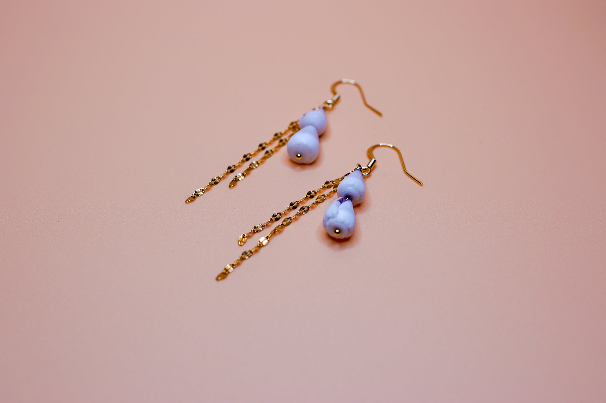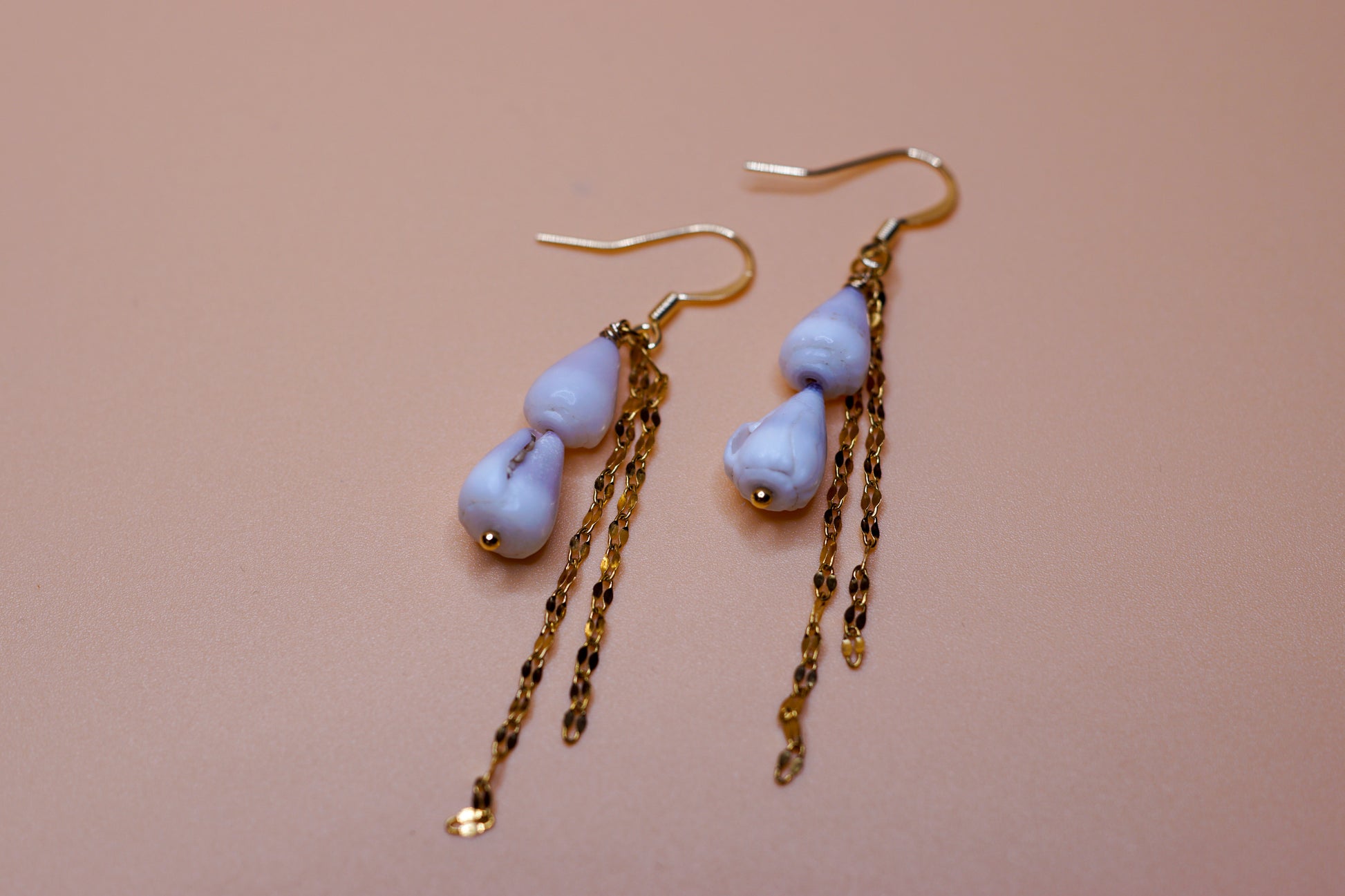 Suspended from 14k gold-filled earring hooks, the natural cone shells are paired with a delicate 18k gold-filled glimmer chain, adding graceful movement and a touch of shimmer with every step.